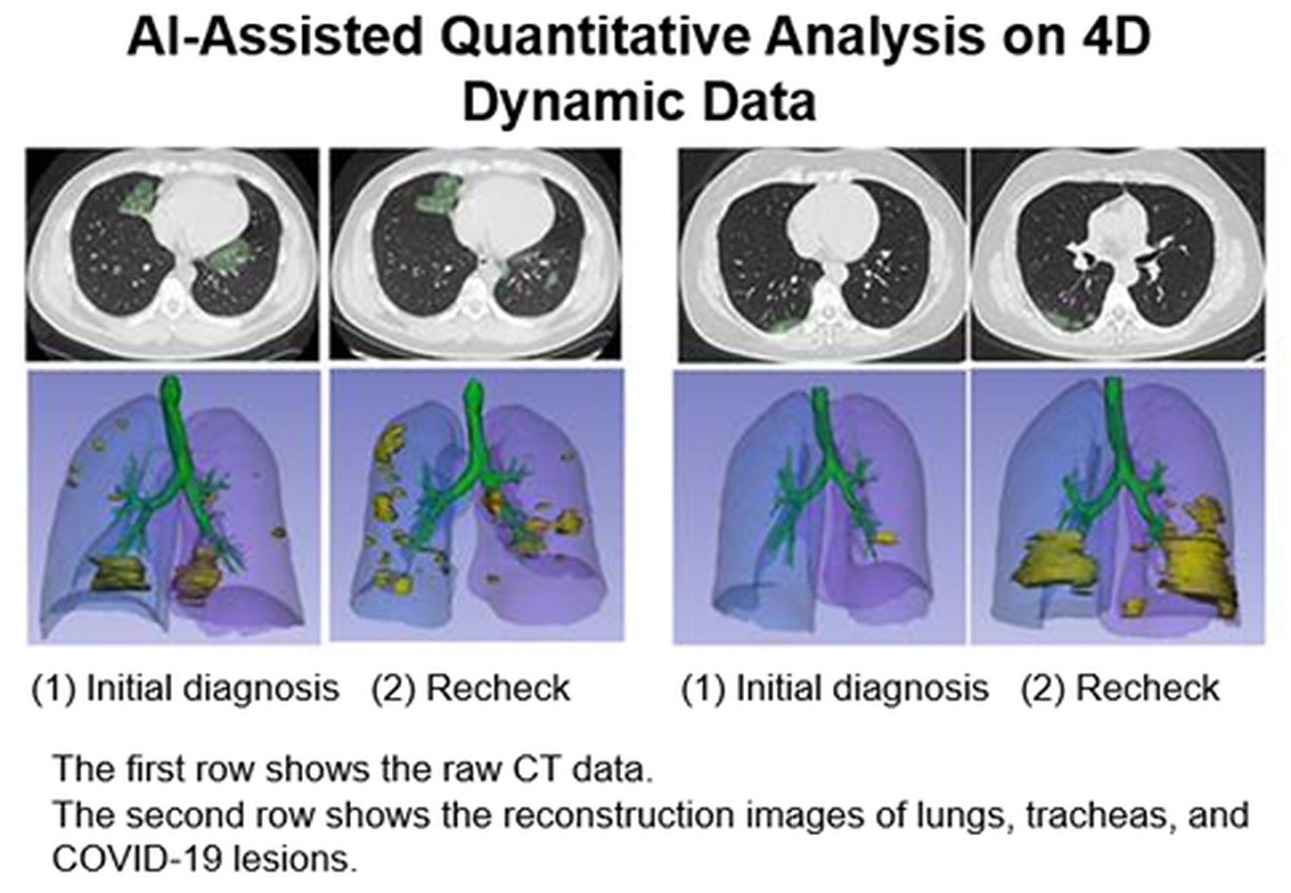 HUAWEI CLOUD ใช้คอมพิวเตอร์วิทัศน์และการวิเคราะห์รูปภาพทางการแพทย์เพื่อแยกแยะระหว่างจุดขาวพร่าในปอด (ground glass opacities - GGOs) จำนวนมาก กับการรวมตัวกันของเนื้อปอด (consolidation) แล้ววิเคราะห์ผลเชิงปริมาณจากผลการตรวจ CT ปอดผู้ป่วย กระบวนการดังกล่าวเป็นการรวมข้อมูลทางอายุรกรรมและผลแล็บเพื่อช่วยให้แพทย์ระบุได้อย่างแม่นยำยิ่งขึ้นว่าโรค COVID-19 อยู่ในระยะเริ่มต้น ระยะลุกลาม หรือระยะรุนแรง ทั้งยังช่วยคัดกรองและป้องกันควบคุมโรคได้ในเบื้องต้น สำหรับเคสผู้ป่วยที่ได้รับการยืนยันแล้วในโรงพยาบาล บริการผู้ช่วย AI จะสามารถ ขึ้นทะเบียนและวิเคราะห์เชิงปริมาณต่อข้อมูลประมวลผล 4 มิติ (4D dynamic data) ที่ได้จากการตรวจสอบซ้ำจำนวนหลายครั้งได้ภายในระยะเวลาสั้นๆ ช่วยให้แพทย์ประเมินอาการของผู้ป่วยและผลกระทบจากการใช้ยาได้อย่างมีประสิทธิภาพ