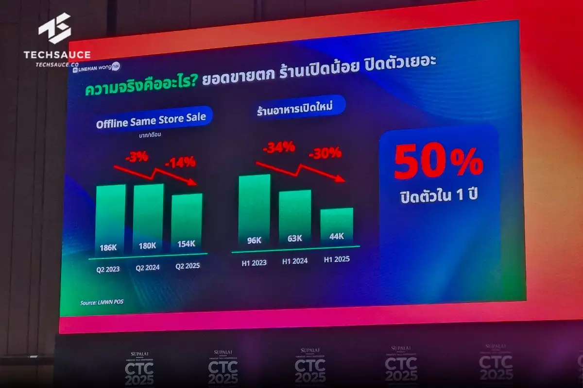 คุณยอด ฉายภาพสไลด์ที่แสดงให้เห็นว่า ยอดขายของร้านอาหารเดิม (Offline Same-Store Sale) ในไตรมาส 2 ของปี 2025 ดิ่งลงถึง 14% เทียบกับช่วงเดียวกันของปีก่อนที่ลดลงเพียง 3% เท่านั้น ขณะที่จำนวนร้านอาหารเปิดใหม่ลดลงอย่างต่อเนื่อง และที่น่ากลัวที่สุดคือ ร้านอาหารที่เปิดใหม่กว่า 50% ต้องปิดตัวลงภายใน 1 ปี