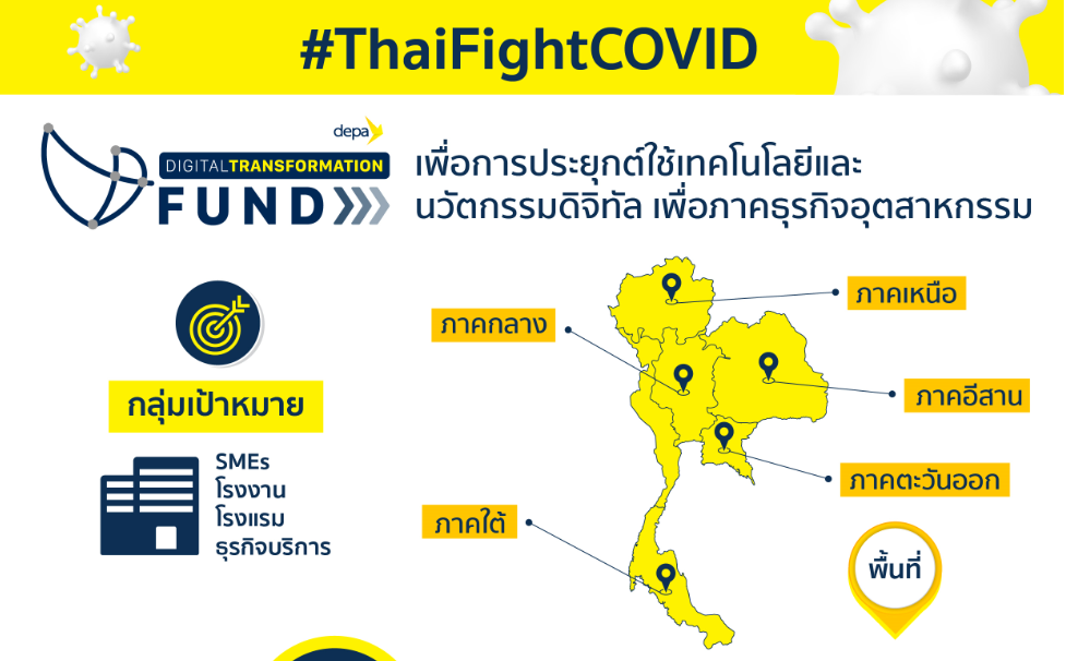 1. depa Digital Transformation Fund เพื่อการประยุกต์ใช้เทคโนโลยีและนวัตกรรมดิจิทัล เพื่อภาคธุรกิจอุตสาหกรรม ตั้งเป้า SMEs โรงงาน โรงแรม ธุรกิจบริการ เกิดการประยุกต์ใช้ดิจิทัล รวม 4 ประกาศฯ แบ่งตามพื้นที่ มุ่งเน้นการเพิ่มประสิทธิภาพกระบวนการผลิตและกระบวนการภายใน ลดต้นทุน สร้างมูลค่าเพิ่ม และเพิ่มรายได้ โดยเปิดรับสมัครตั้งแต่วันที่ 25 มีนาคม – 15 พฤษภาคม 2563