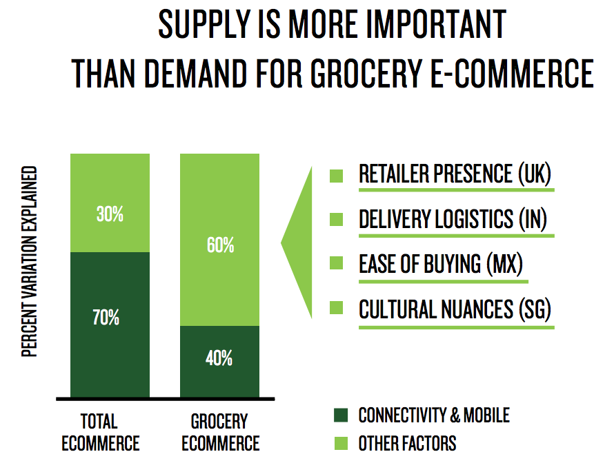 แต่ผลสำรวจ “Nielsen: What’s Next in Ecommerce 2017” จากบริษัทนีลเส็น เผยว่าการที่ผู้คนใช้สมาร์ทโฟนมากขึ้นไม่ได้แสดงถึงความต้องการต่อกลุ่มสินค้า FMCG หรือ online grocery ที่มากขึ้นแต่อย่างใด ความสัมพันธ์ระหว่างการซื้อของสดออนไลน์กับอัตราการใช้งานสมาร์โฟนนั้นเป็นเรื่องยากที่จะคาดเดาและเหตุผลของแต่ละตลาดก็ไม่เหมือนกันอีกด้วย