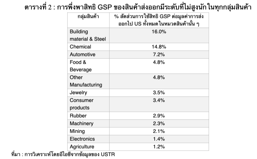 นอกจากนี้ ยังพบว่าแต่ละประเภทสินค้าที่โดนตัดสิทธิมีการพึ่งพา GSP เพื่อการส่งออกไปสหรัฐฯ ในระดับที่ไม่สูงเช่นเดียวกัน โดยวิเคราะห์จากสัดส่วนการใช้สิทธิ GSP ต่อมูลค่าการส่งออกรวมของหมวดสินค้านั้น ๆ ที่ส่งไปสหรัฐฯ (ตารางที่ 2) ซึ่งพบว่ากลุ่มสินค้าส่วนใหญ่มีสัดส่วนไม่ถึง 10% สะท้อนว่าการส่งออกสินค้าของไทยโดยมากไม่ได้มีการพึ่งพาการใช้สิทธิ GSP ในระดับที่สูง โดยมีเพียงกลุ่มสินค้าเคมีภัณฑ์ (Chemical) และวัสดุก่อสร้าง (Building material & Steel) เท่านั้นที่มีการพึ่งพา GSP มากกว่ากลุ่มสินค้าอื่น อย่างไรก็ดี สัดส่วนการพึ่งพา GSP ของทั้งสองกลุ่มสินค้าก็ยังไม่สูงนักโดยมีค่ามากสุดเพียง 16.0% เท่านั้น