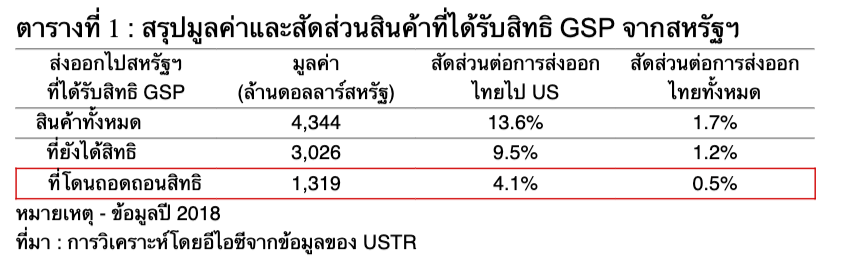 โดยจากข้อมูลของ USTR พบว่าในปี 2018 สินค้าส่งออกของไทยที่มีการใช้สิทธิ GSP มีมูลค่ารวมอยู่ที่ 4.3 พันล้านดอลลาร์สหรัฐ และที่เพิ่งโดนตัดสิทธิ GSP มีมูลค่าอยู่ที่ 1.3 พันล้านดอลลาร์สหรัฐ (ประมาณ 4 หมื่นล้านบาท) คิดเป็นสัดส่วน 4.1% ของมูลค่าการส่งออกไปสหรัฐฯ หรือคิดเป็นสัดส่วนเพียง 0.5% ของการส่งออกรวมของไทย (ตารางที่ 1)