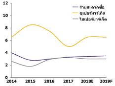 ธุรกิจค้าปลีกสินค้า grocery ในปี 2019 คาดว่า จะเติบโตราว 3-4% แต่ยังเป็นการฟื้นตัวอย่างช้า ๆ จากสภาวะตลาดที่ซบเซาต่อเนื่องในปี 2018 จากการจ้างงานและรายได้ที่ยังอ่อนแอ ทั้งนี้ในปี 2019 ตลาดมีแนวโน้มฟื้นตัวดีขึ้นแต่เป็นการฟื้นตัวอย่างช้า ๆ เนื่องจากภาวการณ์จ้างงานและค่าจ้างแรงงานยังฟื้นตัวในอัตราที่ต่ำ รวมถึงรายได้ภาคเกษตรที่ยังอ่อนแอจากราคาสินค้าเกษตรที่ยังอยู่ในระดับต่ำ ส่งผลให้กำลังซื้อยังฟื้นตัวจำกัดแต่เฉพาะกลุ่มที่มีรายได้ปานกลางถึงสูง ทั้งนี้หากดูภาพรวมการเติบโตของดัชนีค้าปลีกสินค้าไม่คงทนซึ่งเป็นเครื่องชี้วัดภาวะตลาดค้าปลีกสินค้าหมวด grocery จะพบว่า ในไตรมาส 4 ปี 2018 ยอดขายเริ่มมีสัญญาณฟื้นตัวดีขึ้น โดยกลับมาขยายตัวเป็นบวกที่ 1.7% (YOY) จากในช่วง 9 เดือนแรกที่ติดลบ 0.9% (YOY)