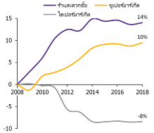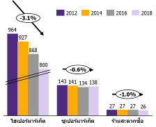 ขณะที่ดัชนีค้าปลีกหมวดห้างสรรพสินค้าและซูเปอร์มาร์เก็ตขยายตัว 5.9% ในปี 2018 ทั้งนี้หากดูการเติบโตของมูลค่าตลาดค้าปลีก grocery ในปี 2018 ที่แบ่งตามประเภทร้านค้าจากข้อมูลของสมาคมค้าปลีกจะพบว่า ร้านgrocery ประเภทซูเปอร์มาร์เก็ตมีแนวโน้มขยายตัวดีกว่ารูปแบบอื่น ๆ โดยเติบโต 6.5% เทียบกับร้านค้าประเภทไฮเปอร์มาร์เก็ตและร้านสะดวกซื้อที่เติบโต 3% และ 3.4% ตามลำดับ ส่วนหนึ่งเป็นผลมาจากกำลังซื้อที่ยังฟื้นตัวจำกัดแต่เฉพาะกลุ่มที่มีรายได้ปานกลางถึงสูงซึ่งเป็นกลุ่มลูกค้าหลักของซูเปอร์มาร์เก็ต