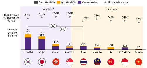จำนวนร้าน grocery และ urbanization rate ของประเทศในเอเชียการแข่งขันในธุรกิจค้าปลีก grocery มีแนวโน้มรุนแรงขึ้นและจะเกิ