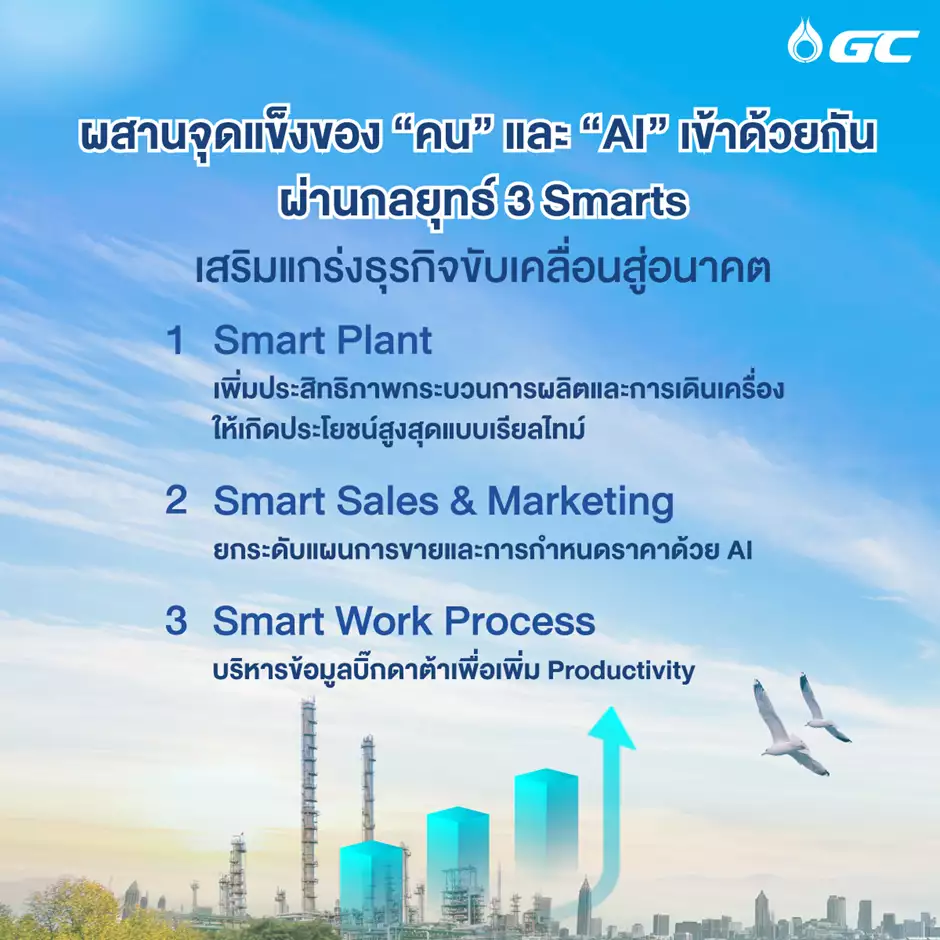 บริษัท พีทีที โกลบอล เคมิคอล จำกัด (มหาชน) หรือ GC กลับมองเห็นโอกาสที่แตกต่าง เมื่อนำจุดแข็งของคน ความคิดสร้างสรรค์ มาผสานกับจุดแข็งของ AI ซึ่งคือ ความรวดเร็วของการประมวลผลข้อมูลมหาศาล ผ่านกลยุทธ์ที่เรียกว่า โมเดล 3 Smarts การทำงานที่ไม่ได้แค่เอา Digital มาแปะไว้บนระบบเดิม แต่เป็นการผสานโครงสร้างข้อมูลใหม่ ให้ AI กลายเป็น Invisible Engine ที่ขับเคลื่อนอยู่เบื้องหลัง