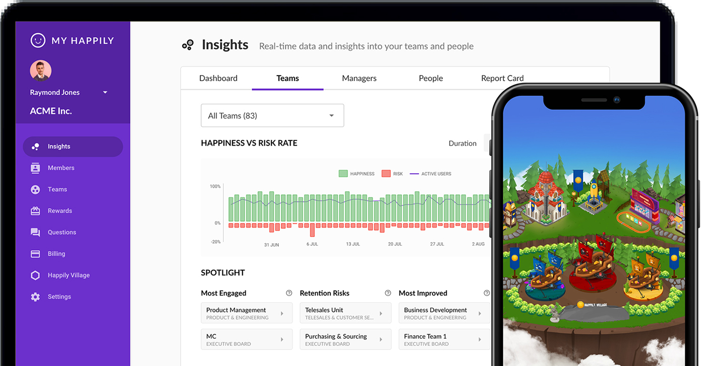 แอพที่ให้บริการผ่านแพลตฟอร์มมือถือนี้ จะช่วยให้องค์กรได้รับข้อมูลเชิงลึกแบบเรียลไทม์ทุกวัน แทนที่จะต้องรอผลรายปีจากแบบสำรวจการมีส่วนร่วมของพนักงาน โดยข้อความที่นำมาวิเคราะห์มาจากคำตอบของพนักงานถึงภาวะอารมณ์ไนที่ทำงานของตน Happily.ai ยังใช้สไตล์ความเป็นเกมและรูปแบบการสะสมแต้มเพื่อช่วยดึงดูดให้พนักงานเข้ามาให้ข้อมูลผ่านแอพทุกวัน โดยฟีดแบ็คที่ได้รับในเวลาที่เหมาะสม บนพื้นฐานของข้อมูล จะช่วยให้หัวหน้างานสามารถรับรู้ความรู้สึก เข้าใจถึงความท้าทายที่ทีมเผชิญอยู่ และสามารถสร้างแรงจูงใจทั้งในระยะสั้นและระยะยาวเพื่อปลูกฝังคุณลักษณะที่สอดคล้องกับวัฒนธรรมขององค์กรได้ แรงจูงใจในที่นี้อาจรวมถึงการโค้ชชิงแบบเวอร์ชวล การแนะนำหนังสือน่าอ่าน และการแสดงความชื่นชมเพื่อสร้างลักษณะนิสัยและวัฒนธรรมเชิงบวก