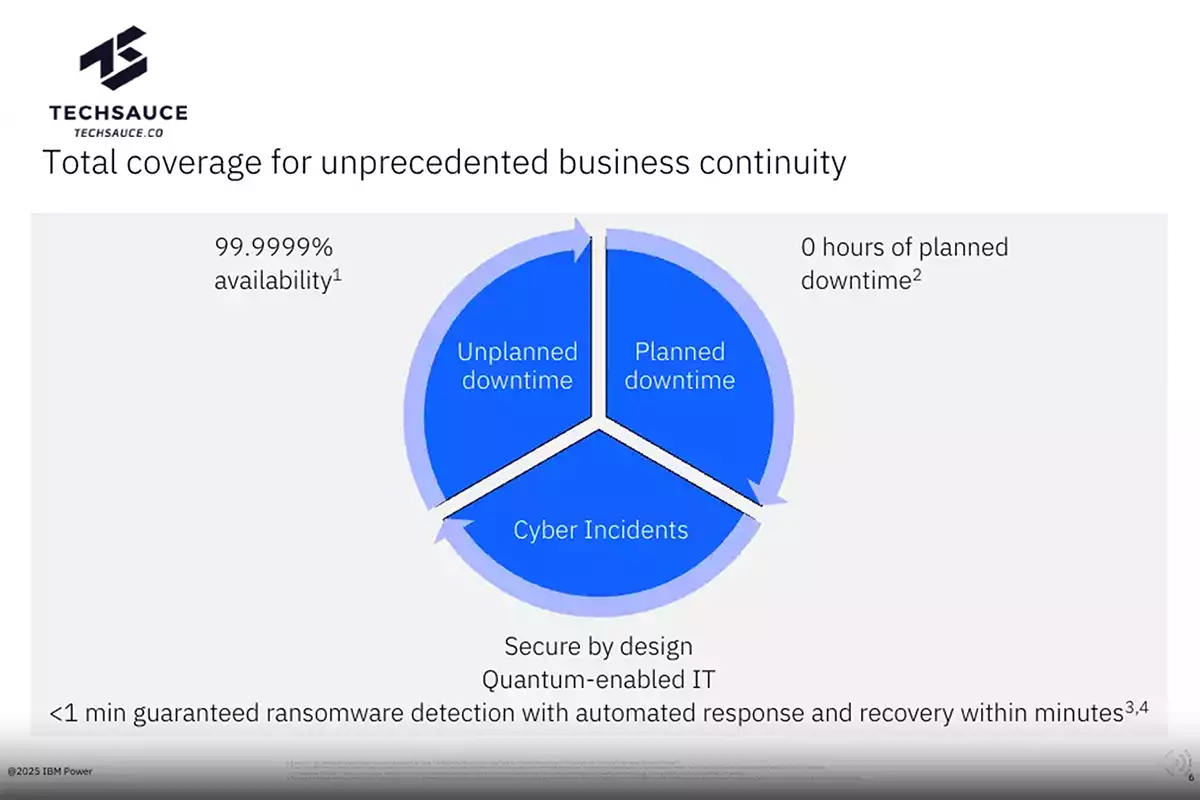 ทั้งนี้นอกจากระบบของ IBM Power จะสามารถจัดการ Downtime แบบ Planned Downtime ที่มีเป้าหมายให้ระบบสามารถทำงานได้ต่อเนื่องในระหว่างอัปเกรดระบบ IBM Power ยังมีความสามารถในการป้องกัน Unplanned Downtime หรือกรณีที่เกิดปัญหากับระบบแบบปัจจุบันทันด่วนจากเหตุไม่คาดคิด เช่น Power Supply เสีย โดยระบบได้ถูกออกแบบมาให้มีโครงสร้างแบบ Fully redundant เพื่อให้สามารถทำงานต่อได้โดยอัตโนมัติ ซึ่งสถาปัตยกรรมของ IBM Power ถูกพัฒนาให้มีความ พร้อมใช้งานสูง (High Availability) ในระดับ 99.9999% Uptime หรือเทียบเท่ากับ Downtime เพียงไม่กี่วินาที