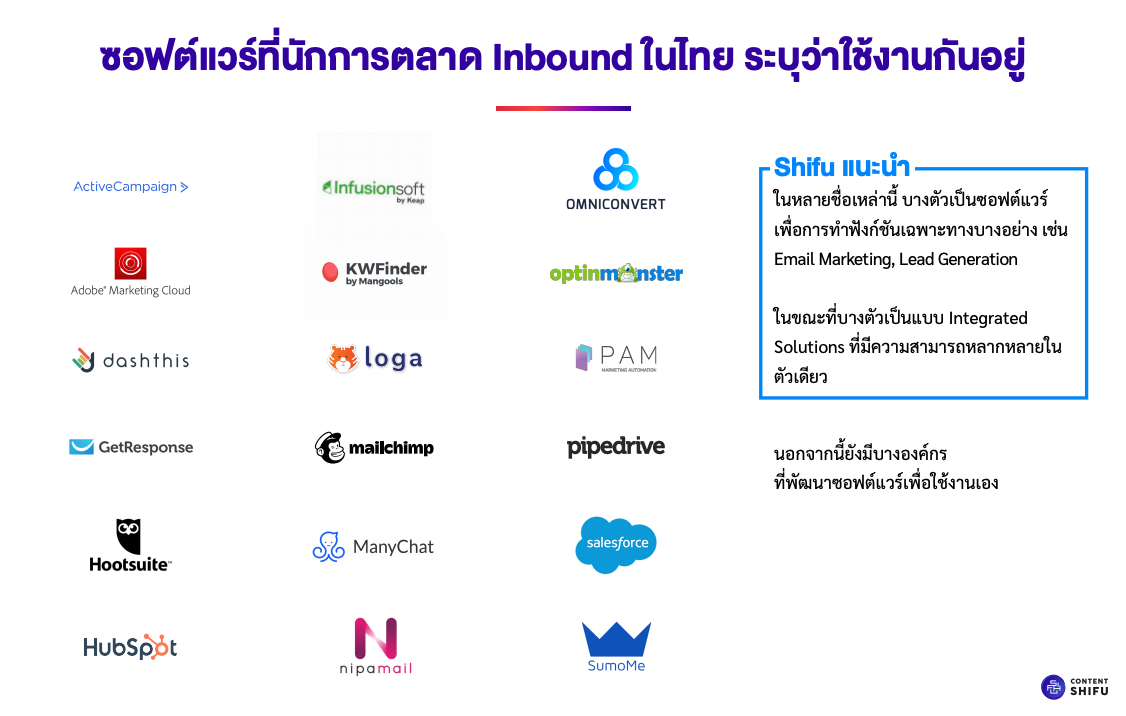 ทั้งนี้ นอกจากเทคโนโลยีการตลาดทั้ง 2 ตัวแล้ว จากรายงานฯ จะพบว่า นักการตลาดที่ทำการตลาดแบบแรงดึงดูด (Inbound Marketing) ก็ใช้ซอฟต์แวร์อีกหลายเครื่องมือในการทำการตลาดเช่นเดียวกัน บ่งบอกว่า วงการการตลาดไทยมีแนวโน้มที่จะขับเคลื่อนด้วยเทคโนโลยีการตลาด (Marketing Technology) กันมากขึ้นในปี 2020