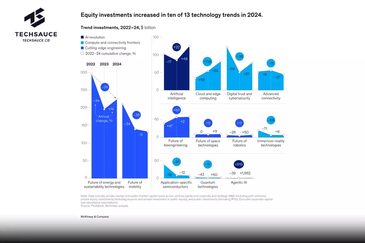 McKinsey เปิดรายงาน Tech Trends Outlook 2025 ซึ่งมีการนำเสนอมุมมองชิงลึกต่อ 13 เทรนด์เทคโนโลยีสุดล้ำ (Frontier Technology) ที่มีศักยภาพพลิกโฉมธุรกิจทั่วโลก รายงานนี้ไม่ได้มาแค่บอกว่ามีอะไรใหม่ แต่เจาะลึกไปถึงเบื้องหลังของทั้ง 13 เทรนด์ ผ่านการวิเคราะห์ข้อมูลเชิงลึกทั้งด้านนวัตกรรม, การลงทุน, ความสนใจจากสื่อ และตลาดแรงงาน เพื่อให้ผู้นำธุรกิจเห็นภาพชัดว่า คลื่นลูกไหนกำลังจะซัดมาที่อุตสาหกรรมของตัวเอง