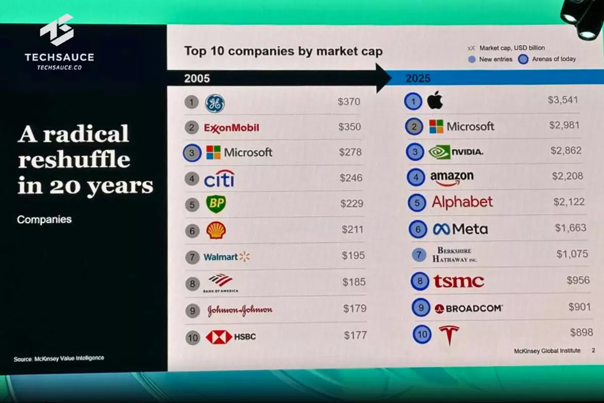 คุณไมเคิลพาไปดู 'มูลค่าธุรกิจ' ที่เปลี่ยนแปลงไปมากเมื่อเทียบปี 2005 กับ 2025 โดยภาพแรกเป็นการเปรียบเทียบ 10 บริษัทที่มีมูลค่ามากที่สุดในโลก ณ ปี 2005 กับปี 2025 ซึ่งมี GE อยู่บนสุดด้วยมูลค่าธุรกิจ ณ ปี 2005 สูงสุดที่ 370 พันล้านดอลลาร์ มาในปี 2025 ไม่มีชื่อ GE ติดอยู่ใน Top 10 แล้ว แต่ปรากฏชื่อ Apple ขึ้นมาเป็นเบอร์หนึ่ง ด้วยมูลค่าธุรกิจ 3,541 พันล้านดอลลาร์