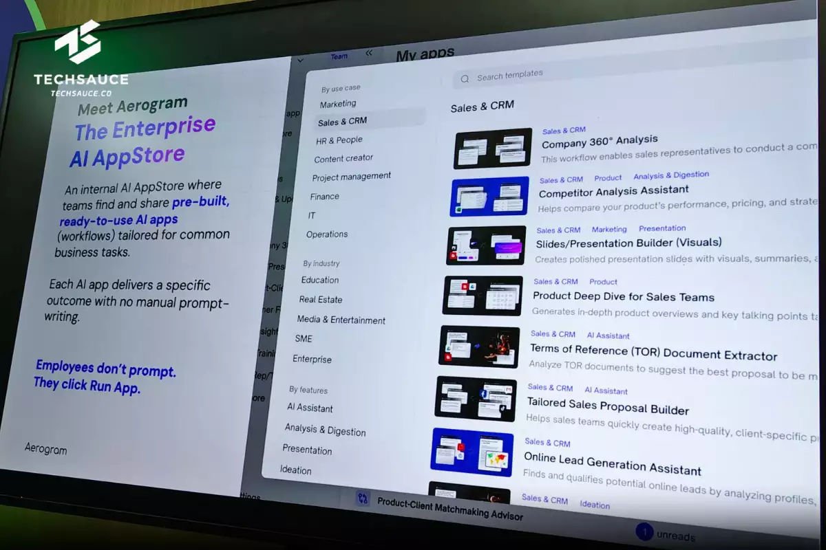 มาที่ Use Case ฝั่งงานขายบ้าง ก่อนที่เซลล์จะเข้าไปหาลูกค้า สามารถให้ AI ใน Aerogram ออกแบบ Standard checklist, ทำ Research ลูกค้า, ออกแบบ Proposal ที่ใช้นำเสนอลูกค้า, วิธีนำเสนอ อธิบาย หรือต่อรองลูกค้า (เช่น หากลูกค้าไม่สนใจสินค้าด้วยเหตุผลหนึ่ง ลูกทีมสามารถใช้วิธีนำเสนอหรือคำพูดต่าง ๆ ที่ปรากฏใน Workflow ไปสื่อสารเพื่อมัดใจลูกค้าได้) หรือกรณีที่รับเซลล์ใหม่ก็สามารถออกแบบ Onboarding Program ที่ไม่ว่าจะเป็นจูเนียร์หรือซีเนียร์ ก็สามารถใช้ Workflow นี้เพื่อทำให้เข้าใจแนวปฏิบัติตรงกันและทำให้ได้ผลลัพธ์ที่ใกล้เคียงกันได้