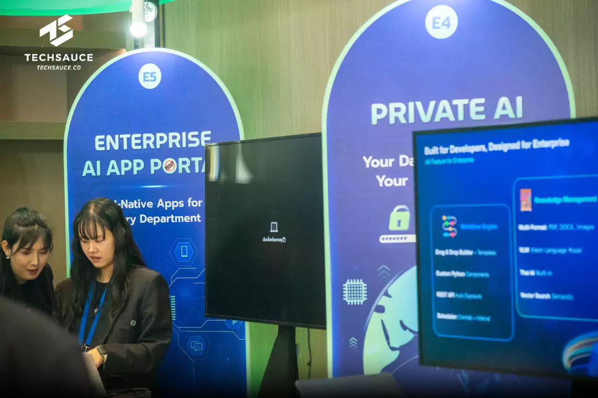 ในโซน Enterprise AI เน้นการยกระดับ AI จากแค่การแชต (Chat-based AI) ไปสู่ระดับ แอปพลิเคชัน (AI-Apps) เพื่อให้พนักงานทุกคนทำงานได้มาตรฐานเดียวกันโดยไม่ต้องเก่งเรื่องการเขียนคำสั่ง (Prompt) แต่ใช้ AI ได้ด้วยแพลตฟอร์มอย่าง Aerogram (AI App สำหรับองค์กร) และ Private AI สำหรับหน่วยงานที่กังวลเรื่องความปลอดภัยของข้อมูล