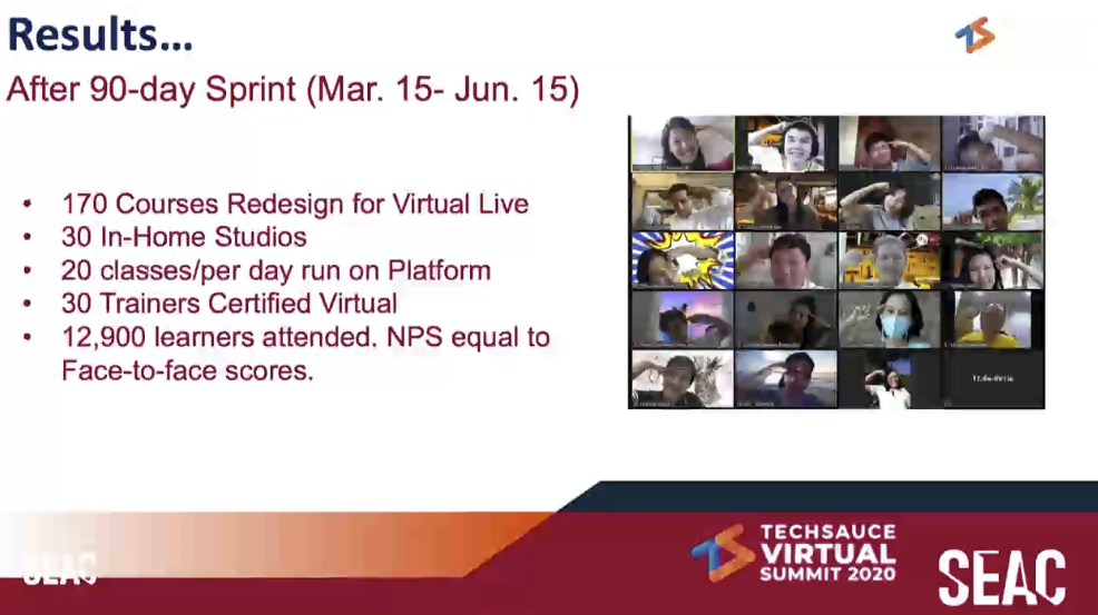 เนื่องจากการระบาดของ COVID-19 ทำให้ SEAC ต้องปรับเปลี่ยนการเรียนทั้งหมดไปสู่การเรียนในรูปแบบออนไลน์ 100% อย่างทันทีในเดือนมีนาคม ทำให้ตอนนั้นต้องสร้างทีม SLAM ขึ้นมา 5 ทีม แต่ละทีมก็จะมีหน้าที่หลักแตกต่างกันไป เช่น ทีมที่รับผิดชอบในการปรับเปลี่ยนดีไซน์การเรียนสอน ทีมฝึกผู้สอนให้ใช้เทคโนโลยี ทีมที่ดูแลเรื่องเทคโนโลยีที่จะนำเข้ามาใช้ และการปรับเปลี่ยนนี้จะต้องทำให้สำเร็จภายในสองอาทิตย์เท่านั้น ซึ่งผลลัพธ์ที่ออกมาก็เป็นที่น่าพึงพอใจมาก ในตอนนี้ SEAC นั้นมีกว่า 170 วิชาที่ปรับรูปแบบการเรียนไปยังออนไลน์ และมีผู้เรียนกว่า 12,900 เข้าเรียนในรูปแบบใหม่นี้ภายใน 3 เดือนเท่านั้น