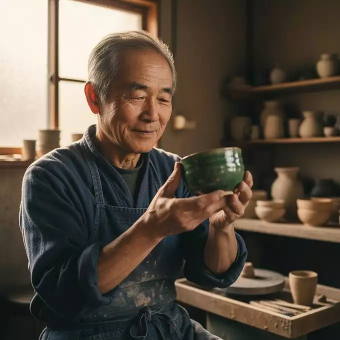 ภาพถ่ายสมจริงแบบโคลสอัพของช่างปั้นชาวญี่ปุ่นสูงวัยที่มีรอยเหี่ยวย่นจากแสงแดดและรอยยิ้มอบอุ่นแฝงปัญญา เขากำลังตรวจสอบถ้วยชาที่เพิ่งเคลือบเสร็จ สถานที่คือเวิร์กช็อปไม้เก่า ๆ ที่เต็มไปด้วยแสงแดดยามบ่ายอุ่น ๆ ส่องผ่านหน้าต่าง เน้นให้เห็นพื้นผิวของดินชัดเจน ถ่ายด้วยเลนส์พอร์เทรต 85 มม. ทำให้ฉากหลังละลายเบลอสวย (โบเก้) บรรยากาศโดยรวมสงบ อบอุ่น และเต็มไปด้วยความเชี่ยวชาญ ภาพแนวตั้ง
