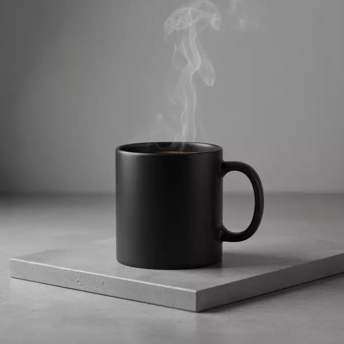 A high-resolution, studio-lit product photograph of a minimalist ceramic coffee mug in matte black, presented on a polished concrete surface. The lighting is a three-point softbox setup designed to create soft, diffused highlights and eliminate harsh shadows. The camera angle is a slightly elevated 45-degree shot to showcase its clean lines. Ultra-realistic, with sharp focus on the steam rising from the coffee. Square image.