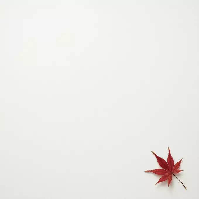 องค์ประกอบแบบมินิมอล โดยมีใบเมเปิ้ลสีแดงอันบอบบางเพียงใบเดียว วางอยู่ที่มุมขวาล่างของเฟรม พื้นหลังเป็นผืนผ้าใบสีขาวอมครีมที่ว่างเปล่า สร้างพื้นที่ว่างสำหรับข้อความได้มาก แสงอ่อนที่กระจายตัวมาจากมุมซ้ายบน ภาพสี่เหลี่ยมจัตุรัส