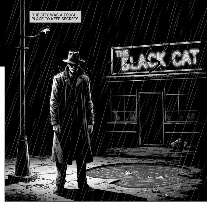 แผงการ์ตูนเพียงช่องเดียวในสไตล์นัวร์ที่ดิบและกร้าน ใช้หมึกขาวดำที่มีคอนทราสต์สูง ด้านหน้า นักสืบในเสื้อโค้ทยืนอยู่ใต้เสาไฟถนนที่ไฟกระพริบ ฝนโปรยลงบนบ่าเขา ด้านหลัง ป้ายไฟนีออนของบาร์ร้างสะท้อนในแอ่งน้ำ ที่ด้านบนของแผงมี กล่องบรรยาย เขียนว่า "เมืองนี้มันยากที่จะเก็บความลับ" แสงที่ส่องลงมารุนแรง สร้างบรรยากาศดราม่าและหม่นหมอง ภาพแนวนอน