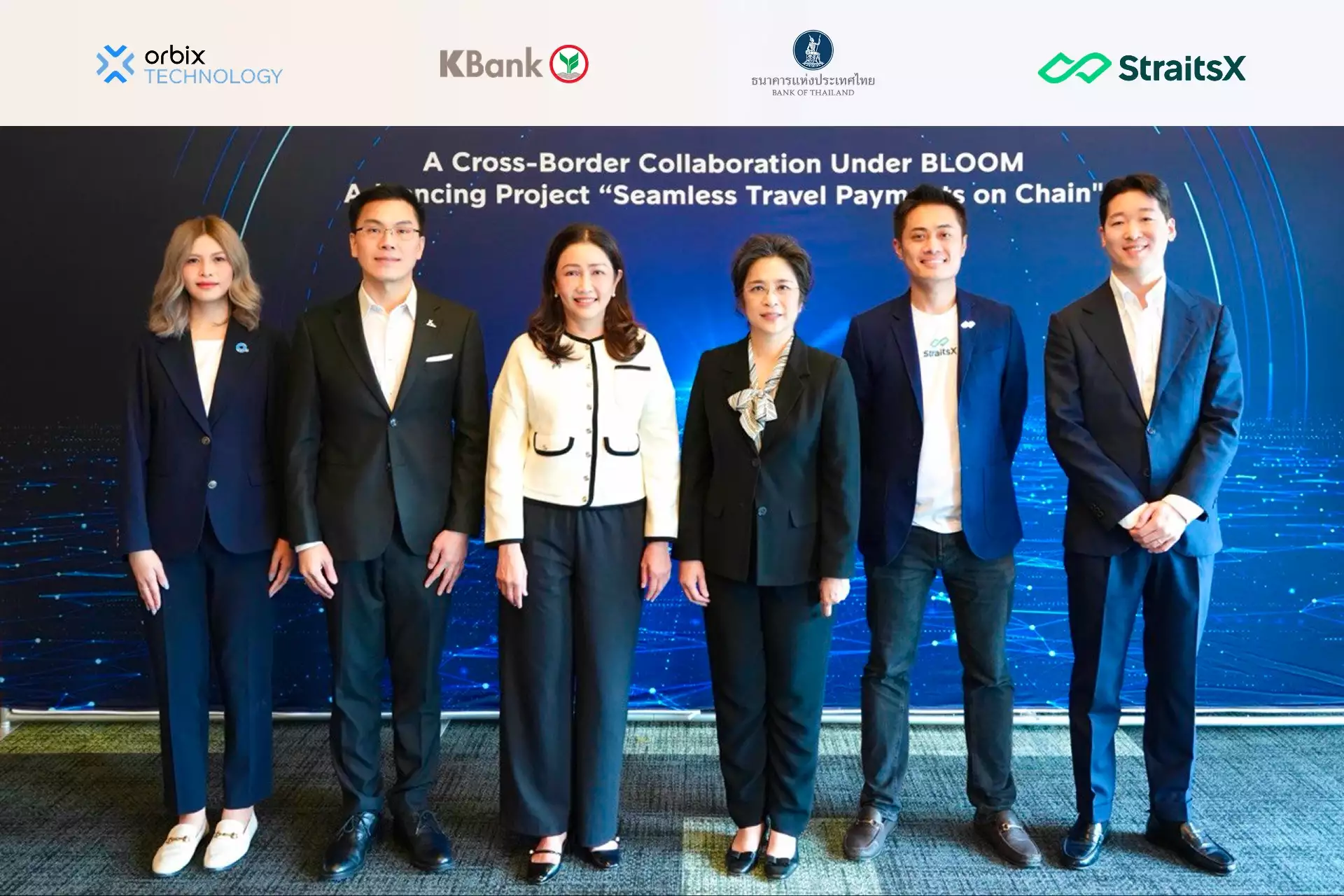 โดย ดร. กรินทร์ บุญเลิศวณิชย์ รองผู้จัดการใหญ่ ธนาคารกสิกรไทย และ Mr.Tianwei Liu Co-Founder & CEO จาก StraitsX ได้ประกาศความร่วมมือเพื่อพัฒนาโครงการ “Seamless Travel Payments on Chain” ซึ่งอยู่ภายใต้โครงการ “BLOOM’’ ความร่วมมือในระดับนานาชาตินำโดยธนาคารกลางสิงคโปร์ (MAS) โดยมีพันธมิตรหลักได้แก่ KBank, Orbix Technology (บริษัทภายใต้กลุ่มธุรกิจทางการเงินธนาคารกสิกรไทย) และ StraitsX