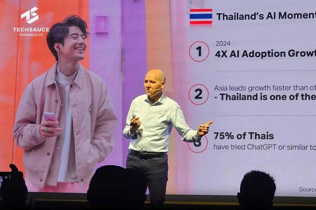สำหรับประเทศไทย คุณซิกเว่ชี้ให้เห็นภาพ 2 ด้านที่น่าสนใจ: 1. ข่าวดี คือคนไทยมีการปรับตัวใช้ AI ในระดับบุคคลสูงมากถึง 78% ซึ่งเป็นตัวเลขที่ค่อนข้างสูงมาก 2. ข่าวร้าย คือการนำ AI ไปใช้ในภาคธุรกิจและหน่วยงานภาครัฐยังอยู่ในระดับที่ต่ำมาก โดยเฉพาะในอุตสาหกรรมหลักของประเทศ เช่น เกษตรกรรม, การผลิต และค้าปลีก ซึ่งยังตามหลังอยู่มาก หากภาคอุตสาหกรรมหลักเหล่านี้ไม่สามารถนำ AI มาปรับใช้ได้ประเทศไทยจะถูกทิ้งไว้ข้างหลังและจะเติบโตทางเศรษฐกิจได้ยากลำบาก
