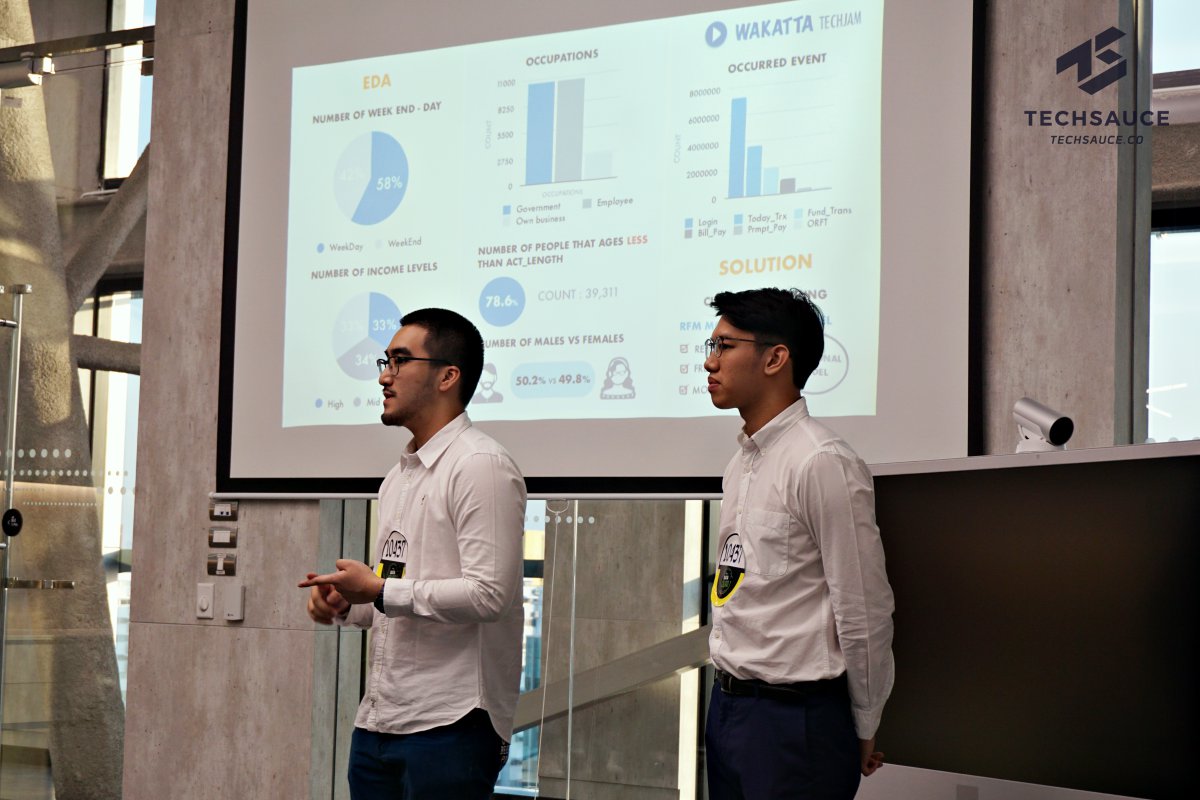 ส่วน Data Squad ทีม TEMP เล่าวว่าพวกเขาจะได้รับโจทย์เดียวคือการทำนายพฤติกรรมผู้ใช้ ภายในเวลา 7 ชั่วโมงของการแข่งขัน โดยทุกทีมจะได้ชุดข้อมูลจำลอง (Simulated Data) ที่เป็นประวัติการทำธุรกรรม 22 สัปดาห์จาก User เกือบ 50,000 คน โดยต้องหาให้ได้ว่าในสัปดาห์ที่ 23 ผู้ใช้เหล่านี้จะมีพฤติกรรมอย่างไร
