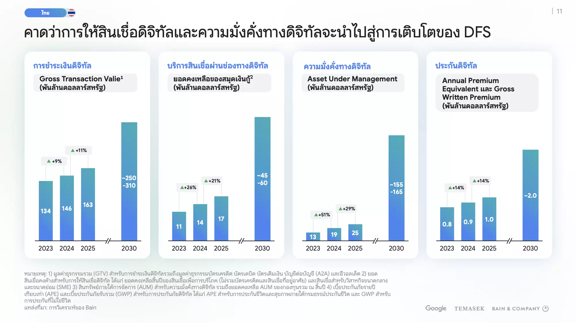 การชำระเงินดิจิทัลยังคงเป็นภาคส่วนที่มีมูลค่าสูงที่สุดของประเทศ โดยได้แรงขับเคลื่อนจาก Promptpay และ QR Code Payment สินเชื่อดิจิทัลก็เป็นอีกหนึ่งในกลไกขยายตัวหลัก เนื่องจากผู้บริโภคและ SME สามารถเข้าถึงเงินทุนได้ง่ายขึ้นผ่านแพลตฟอร์มออนไลน์ ขณะเดียวกัน Digital Wealth ก็เติบโตอย่างรวดเร็วตามพฤติกรรมการลงทุนของคนรุ่นใหม่ด้วยเช่นกัน