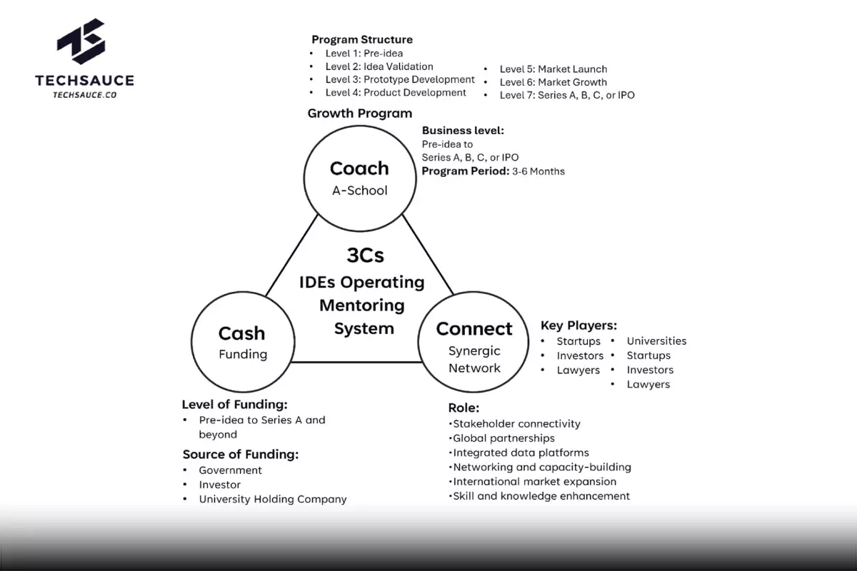 ซึ่งเป็นกรอบการทำงานที่ผสมผสาน 'พี่เลี้ยง-เงินทุน-เครือข่าย' เข้าไว้ด้วยกัน เพื่อปิดช่องว่างในระบบนิเวศนวัตกรรมของไทย และเป็นแนวทางสนับสนุนวิสาหกิจที่ขับเคลื่อนด้วยนวัตกรรม (Innovation-Driven Enterprises หรือ IDEs) โดยเฉพาะ ซึ่งได้มีการนำร่องไปใช้แล้วกับโครงการ Growth Program 2024