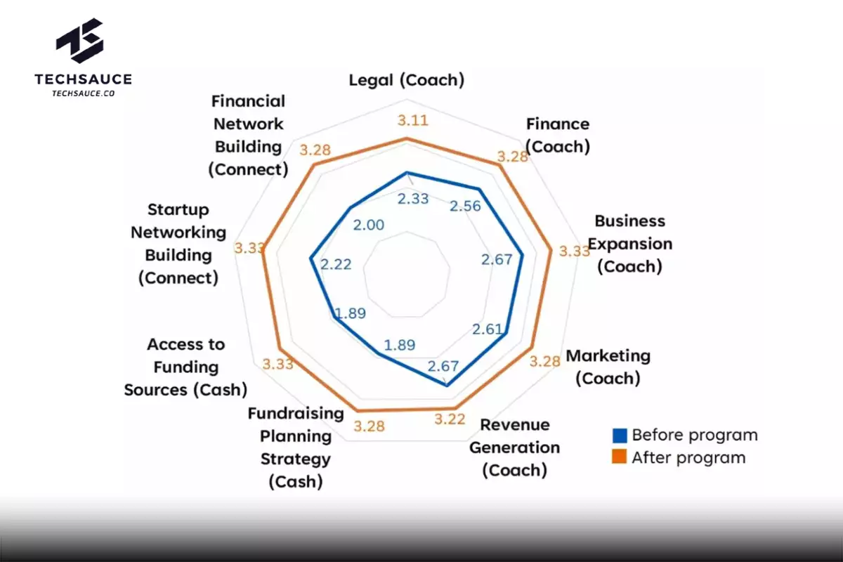 สตาร์ทอัพที่เข้าร่วมโครงการได้ผ่านกระบวนการบ่มเพาะเข้มข้นตลอด 3-6 เดือน ทั้งการอบรม, การให้คำปรึกษาแบบตัวต่อตัวกับพี่เลี้ยงมืออาชีพ 10 ท่าน, และกิจกรรมสร้างเครือข่าย ซึ่งก็พบว่าสตาร์ทอัพทั้ง 18 ทีมที่ส่งผลครบถ้วน มีพัฒนาการที่ดีขึ้นในทุกมิติอย่างมีนัยสำคัญ โดยเฉพาะในด้าน Cash ที่มีพัฒนาการโดดเด่นที่สุด สัะท้อนให้เห็นว่าโครงการสามารถแก้ปัญหาที่เป็นจุดอ่อนที่สุดของผู้ประกอบการไทยได้อย่างตรงจุด