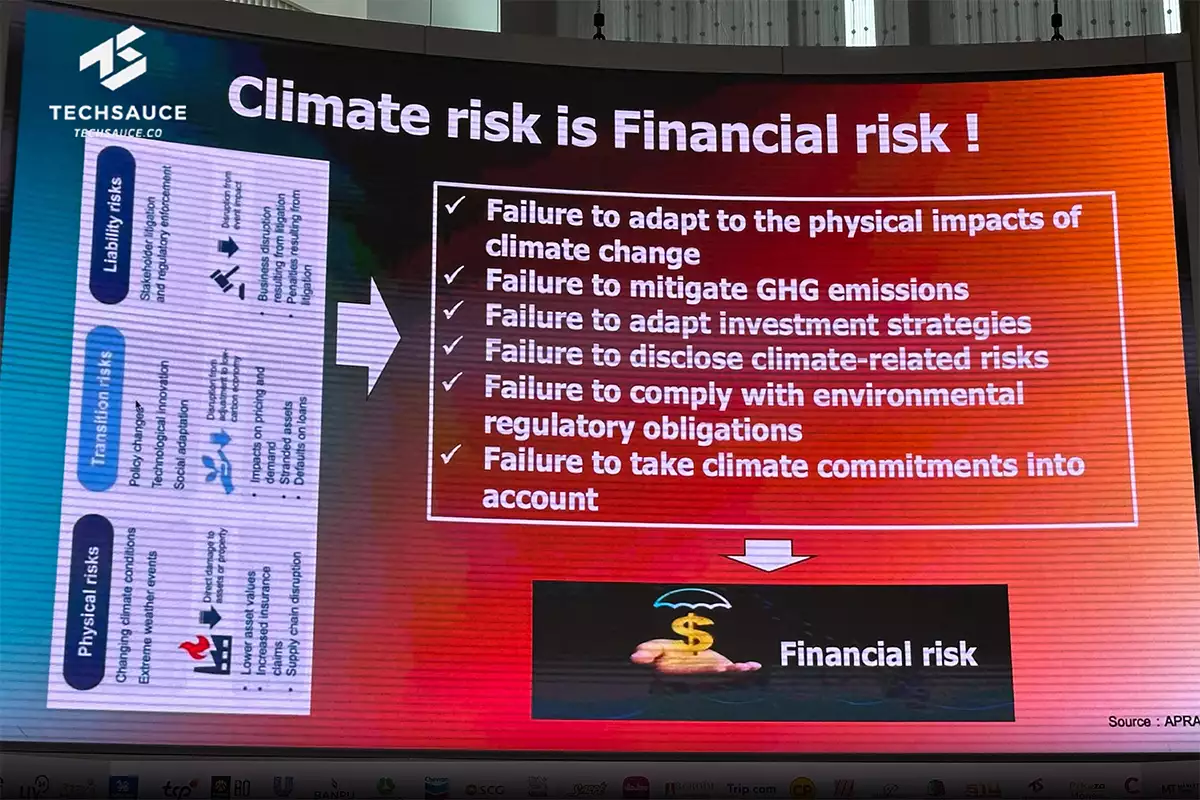 และยิ่งสภาพภูมิอากาศแปรปรวนก็ยิ่งส่งผลให้เกิดปัญหาหลายด้านตามมา ซึ่งถ้ามองในมุม Climate Risk รศ.ดร.เสรีบอกว่า หากไม่มีแนวทางจัดการหรือแผนรับมือล่วงหน้า จะส่งผลกระทบต่อ Financial Risk หรือการเงินของภาคธุรกิจ เพราะอาจต้องใช้แก้ปัญหา ใช้ขับเคลื่อนธุรกิจ หรือใช้ฟื้นฟูกิจการ ทุกภาคส่วนจึงต้องเตรียมความพร้อมและหาทางรับมือล่วงหน้า เพื่อลดผลกระทบ เตรียมการให้สามารถฟื้นฟูตัวเองได้ (Resillience) และมีความยืดหยุ่น พร้อมที่จะปรับตัว