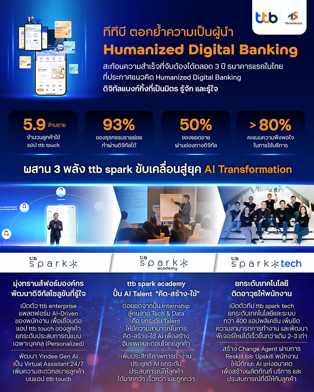 ความสำเร็จในปัจจุบันเป็นผลสืบเนื่องมาจากแบรนด์ ttb spark ทีมหน้าบ้านที่ขับเคลื่อน Business Transformation ผ่านแพลตฟอร์มดิจิทัล ซึ่ง ttb ฟอร์มทีมขึ้นเมื่อ 3 ปีก่อน เพื่อเป็น Catalyst ขับเคลื่อนการทรานสฟอร์มองค์กรสู่ Digital & Tech และชูภาพลักษณ์ Digital Banking โดยพัฒนาดิจิทัลโซลูชันที่จับต้องได้ผ่านแอป ttb touch ที่ครองใจลูกค้ากว่า 5.9 ล้านราย และล่าสุดได้เปิดตัวแพลตฟอร์มใหม่ ttb enterprise สำหรับพนักงาน ซึ่งจะเปลี่ยนให้การปฏิสัมพันธ์ระหว่างพนักงานกับลูกค้ามีความหมายและเป็นแบบเฉพาะบุคคล (Personalized) มากขึ้น โดยใช้ AI วิเคราะห์ข้อมูลพฤติกรรมการใช้งานของลูกค้าบนแอป ttb touch เพื่อส่งมอบประสบการณ์ทางการเงินที่รู้จักและรู้ใจอย่างไร้รอยต่อ แม่นยำ และรวดเร็ว (Omnichannel Experience) ถือเป็นการพลิกโฉมการให้บริการ โดยทำงานร่วมกับอีก 2 องค์ประกอบสำคัญเพื่อส่งมอบผลลัพธ์ที่จับต้องได้ให้แก่ลูกค้า คือ