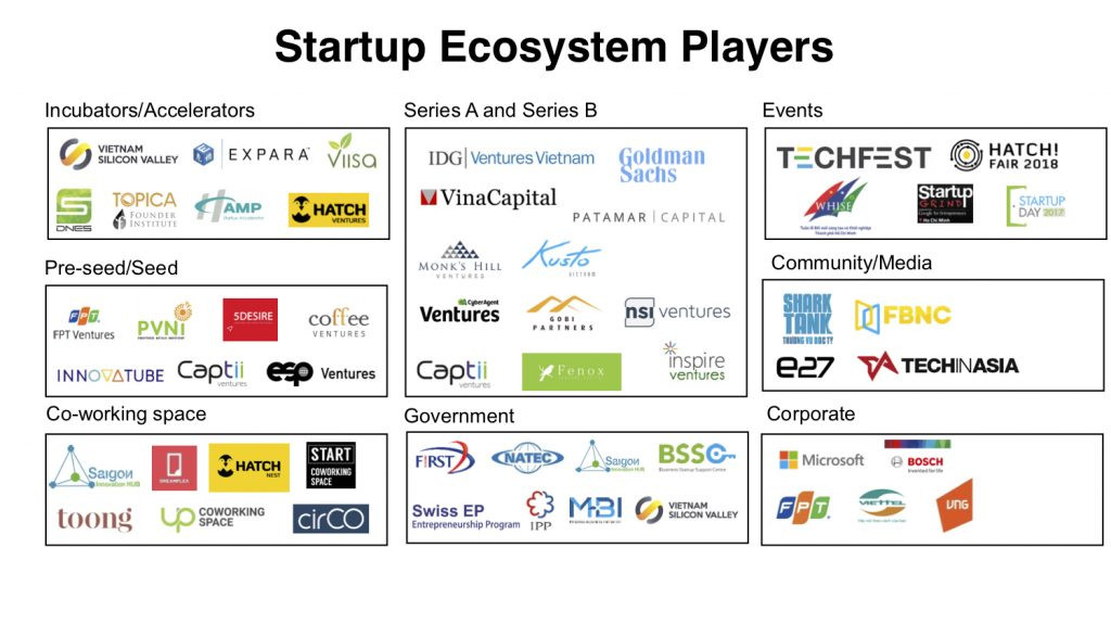 แผนภาพ Startup Ecosystem ในประเทศเวียดนาม Source: Saigon Innovation Hubด้านการสนับสนุนทุน ส่วนใหญ่มาจากทางฝั่งของ VC โดยเป็นกองทุนข้ามชาติมากกว่ากองทุนในประเทศ ส่วน CVC นั้นมาจากธุรกิจข้ามชาติและกิจการที่อยู่ในกำกับของภาครัฐมากกว่าบริษัทเอกชนในประเทศ