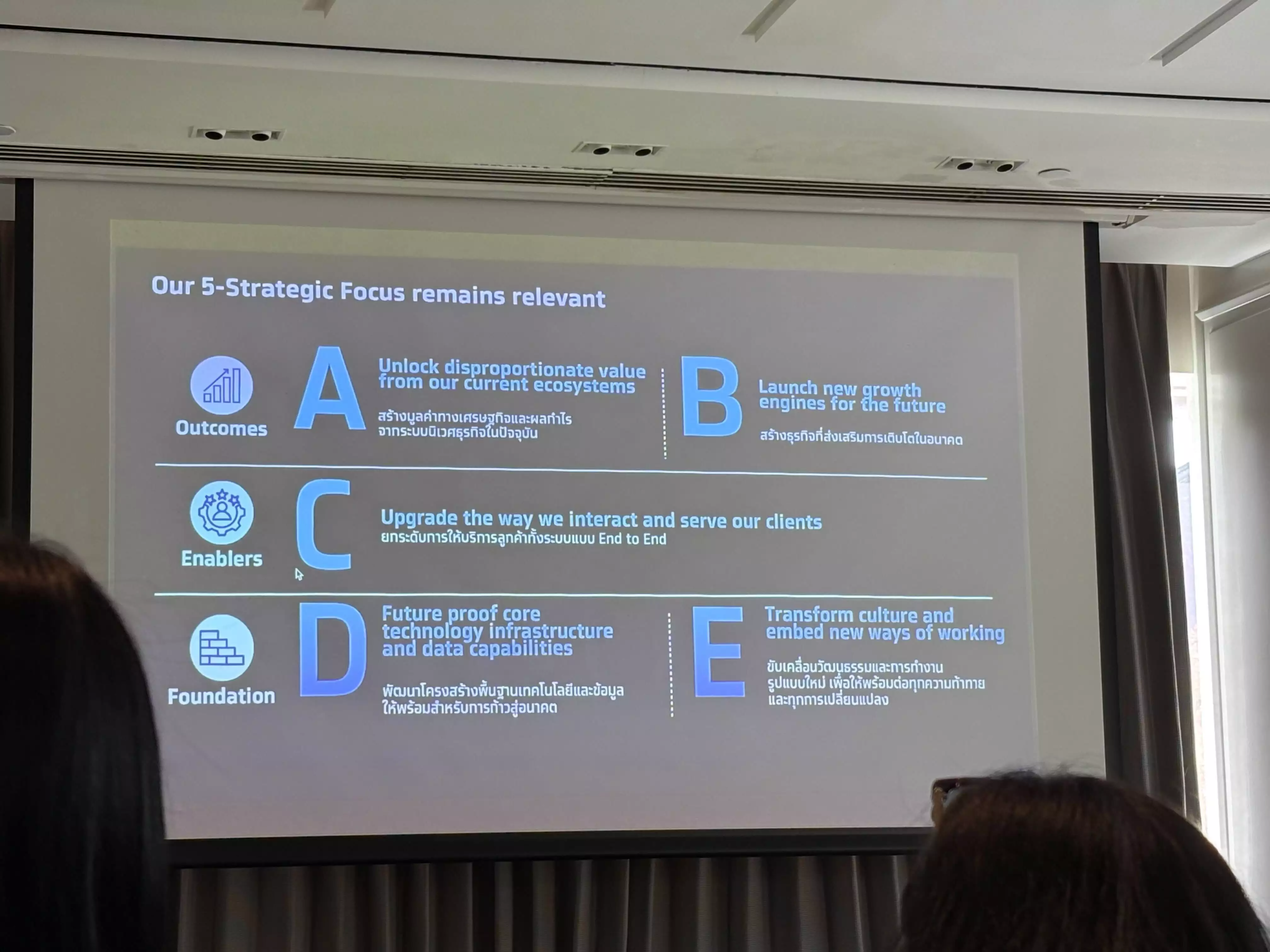 ส่วนล่างของสไลด์เป็นข้อ D และ E ซึ่งคือพื้นฐานที่ทำให้ทุกอย่างด้านบนเกิดขึ้นจริงได้ ข้อ D คือการสร้างระบบเทคโนโลยีที่รองรับผู้ใช้จำนวนมากได้อย่างเสถียร เพราะแพลตฟอร์มของกรุงไทยต้องรองรับผู้ใช้หลักสิบล้านถึงสี่สิบล้านคนในเวลาเดียวกัน และต้องเติบโตได้ทันทีเมื่อบริการใหม่ถูกเปิดตัว นี่คือจุดที่ธนาคารต้องคิดแบบบริษัทเทคมากกว่าธนาคารแบบเดิม