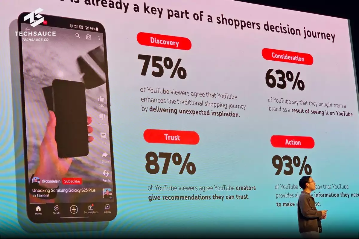 คุณอาร์มได้เริ่มต้นด้วยการตอกย้ำว่า YouTube ได้กลายเป็นส่วนสำคัญอย่างยิ่งในเส้นทางการตัดสินใจซื้อของผู้บริโภคไปแล้วโดยมีข้อมูลสถิติที่น่าสนใจซึ่งเปรียบเสมือน Customer Journey 4 ขั้นตอนหลัก
