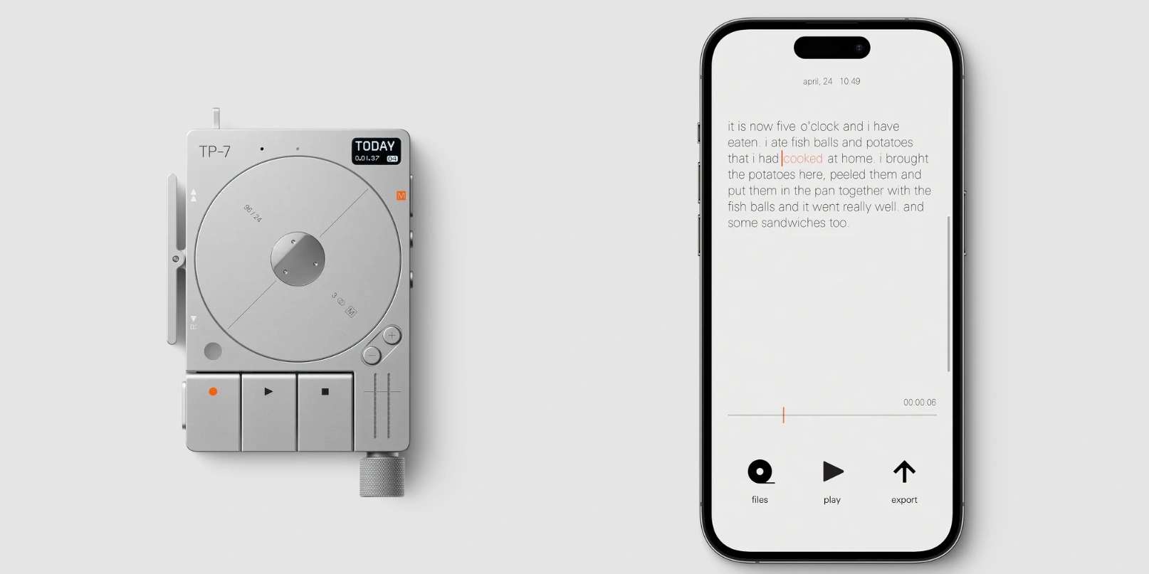 การออกแบบของเครื่องบันทึกเสียง TP-7 ผสมผสานระหว่างเทคโนโลยีสมัยใหม่แต่ยังคงความคลาสสิค ที่เหมือนย้อนไปในยุคที่คาสเซ็ตเทปได้รับความนิยม ขนาดของเครื่องเท่ากับกล่องสำรับไพ่ ตัวปุ่มกดมีความคลาสสิคเหมือนคาสเซ็ตเทปยุค 90มีเครื่องกลึงเทปอยู่ตรงกลางเคลื่อนไหวด้วยมอเตอร์ ขณะที่กำลังบันทึกเสียง